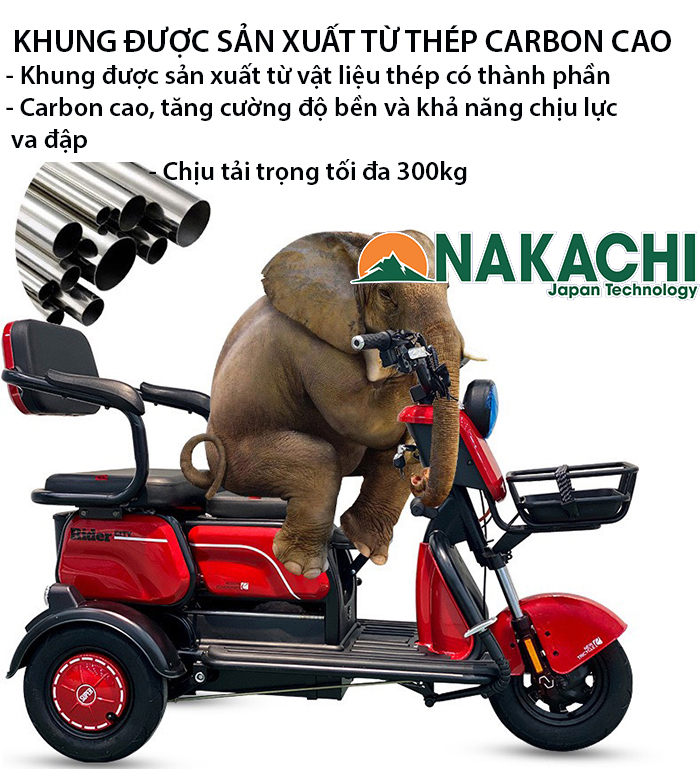 Xe điện Nakachi NC-X03 được thiết kế với 3 bánh lớn chắc chắn, giúp xe giữ thăng bằng tốt khi di chuyển.